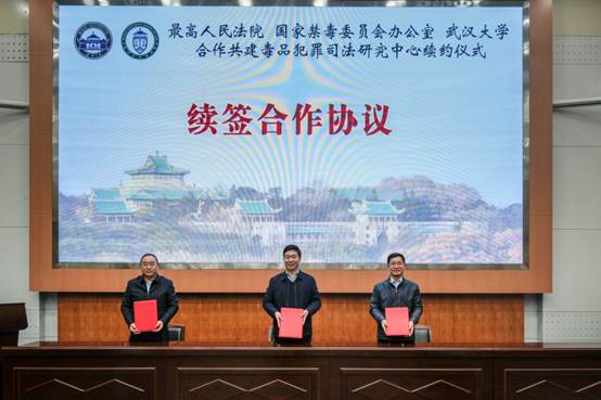 党委副书记沈壮海,最高人民法院刑事审判庭第五庭副庭长方文军,国家禁毒委员会办公室、公安部禁毒局政策法规处处长李晓代表三方机构,签署了合作共建毒品犯罪司法研究中心的续约协议。