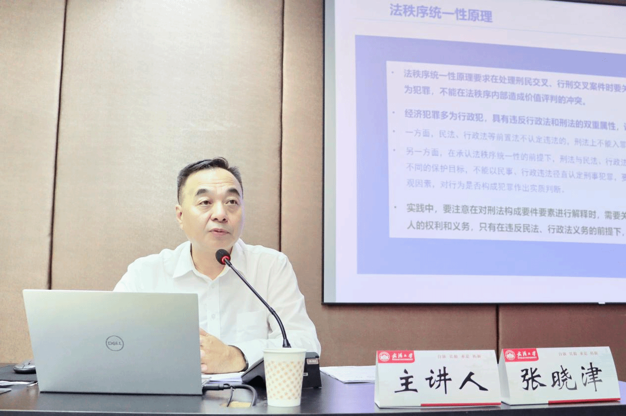 张晓津厅长围绕经济犯罪案件办理的实务问题展开讲授。张晓津厅长首先从当前经济犯罪的特点切入,指出目前经济犯罪面临犯罪形势严峻,案件持续增多,新情况新问题频出,犯罪产业化、专业化、集团化问题突出,形成完整犯罪生态,经济犯罪向公共安全领域传导,社会危害性增大等挑战。其次,张晓津厅长阐述了检察机关在经济金融工作中应坚持服务党和国家工作大局、坚持以人民为中心的价值取向、坚持依法履职与贯彻刑事政策相结合、坚持高质效办好每一个案件的基本原则。最后,他结合司法实践中的典型案例,提出高质效办理经济犯罪案件应正确处理刑法与前置法的关系,并对各种利益在考察、比较的基础上进行权衡和取舍,合理地解释刑法,同时也要准确理解、领会党和国家经济发展政策,服务党和国家经济发展大局。