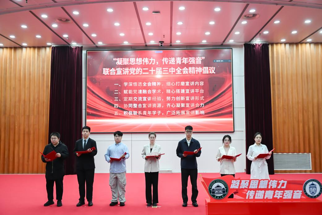 习近平法治思想宣讲团、中国政法大学习近平法治思想研究院博士生宣讲团,浙江大学习近平法治思想学生宣讲团,中山大学习近平法治思想青年研习会等七所高校宣讲团代表齐聚一堂,共同发起“凝聚思想伟力,传递青年强音”联合宣讲党的二十届三中全会精神倡议。各宣讲团发挥特长与优势,凝心聚力,协同联动,共同学习、贯彻、宣传党的二十届三中全会精神。联合倡议从宣讲内容、宣讲平台、宣讲形式、宣讲合力、宣讲影响等方面规划了未来的行动方向。接下来,在“联合倡议”搭建的新平台上,各宣讲团将优势互补,继续加强合作,为党的二十届三中全会精神的传播贡献出青年博士宣讲团的力量。