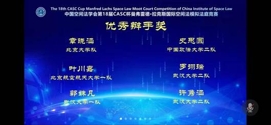 (通讯员:查汉辉、李想)12月10日至12日,由外交部条法司指导、中国空间法学会主办的第18届CASC杯曼弗雷德·拉克斯(Manfred Lachs)国际空间法模拟法庭竞赛通过线上方式举办。来自北京大学、北京航空航天大学、北京理工大学、中国政法大学、上海交通大学、华东政法大学、中南财经政法大学、黄色仓库