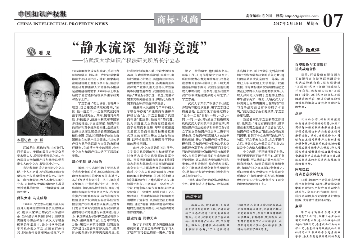 当记者问及宁立志新的工作目标,他笑言:“肯定有新的目标,但不想在未实现之前就讲!”记者在“武大知识产权与竞争法”微信公众号的发刊词里,看到了宁立志所写的这样几句话:“行之于未言之前,言之于既行之后,多做少说,先做后说!”也许,这就是宁立志做人做事的风格。