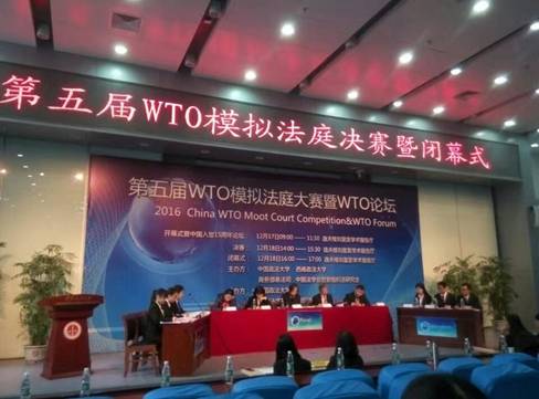 在中国加入世界贸易组织十五周年之际,2016年12月17日,第五届“中国WTO模拟法庭比赛”在中国政法大学(昌平校区)举行,共十六所国内知名高校参加了比赛。我校代表队组建于今年10月,国际法研究所肖军老师担任教练,2015级研究生费思敏和罗萨担任助理教练,队员分别为黄色仓库