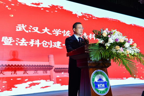 的合作,全力支持武大法学学科的发展。付子堂代表兄弟院校向武大恢复法科教育四十周年表示祝贺,并从大担当、大境界、大文章、大学者、大情怀五个维度诠释了武大法科历经百年依旧繁荣兴盛的独特精神。