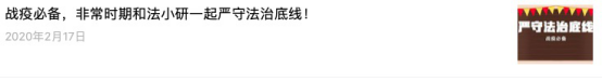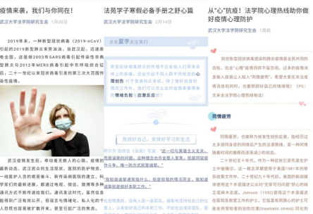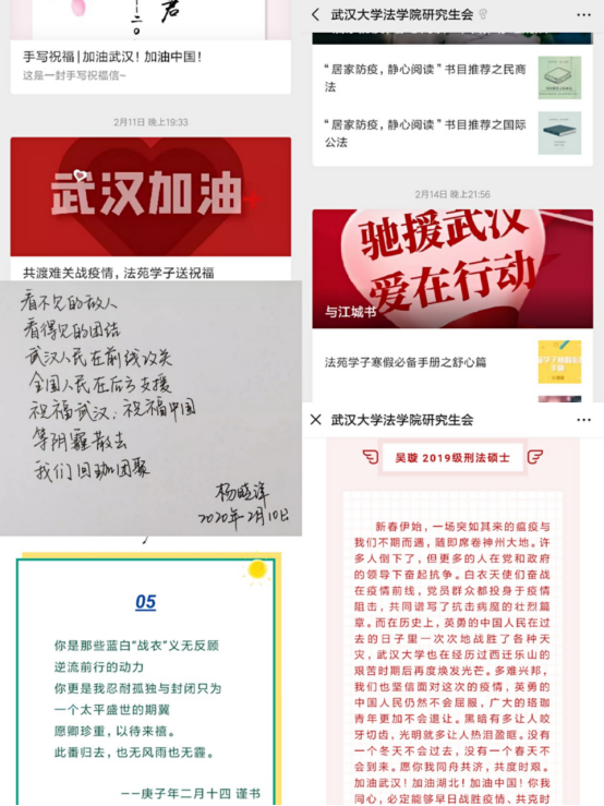 新型冠状病毒感染的肺炎防控指挥部通告》《重磅!关于疫情应对,习近平总书记重要讲话全文来了》以及《权威!新型冠状病毒感染的肺炎有何症状?如何预防?口罩如何选?》等文章,汇总官方信息,引导大家关注疫情并正确、有效了解和应对疫情,为防疫期间各类困难提供了指导办法。推出《与学生书》《与江城书》号召广大法苑学子安心在家学习,手写祝福,为武汉加油打气。此外,研会着重发挥学科优势,制作整理《战疫必备,非常时期和法小研一起严守法治底线》推文,在同学间营造了不信谣、不传谣,风清气正、积极健康的良好氛围。