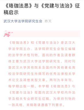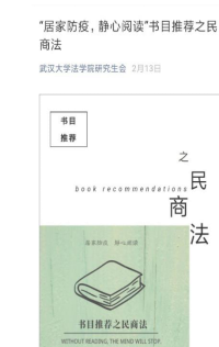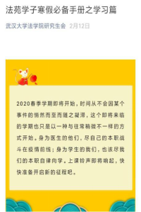 疫情阻碍了珞珈法科学子的回“珈”之路,但同学们肩负的学术研究工作却依然在稳步推进。为了让同学们在疫情期间能够充实自我、潜心修学,研究生会公众号推出了《法苑学子寒假必备手册之学习篇》,详细地介绍了学院在疫情期间的教学工作安排,贴心地收集了疫情期间免费开放的数据库的信息,消除了同学们在家学习研究的“后顾之忧”。同时,研会公众号还推送了《“居家防疫,静心阅读”书目推荐》,其中包含了各个专业方向的推荐书目,每一本都是精心挑选的名家大作,希望同学们居家防疫的同时能阅读经典,夯实专业基础,提高学术素养。研会还充分发挥两本院刊《珞珈法思》、《党建与法治》的学术功能,积极开设和征集与疫情相关的学术思考研究成果,以展现珞珈法律人在战“疫”中的法学思辨风采。