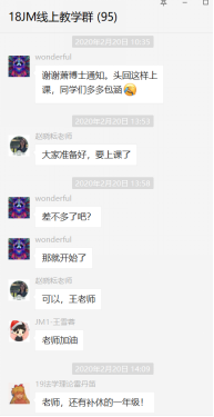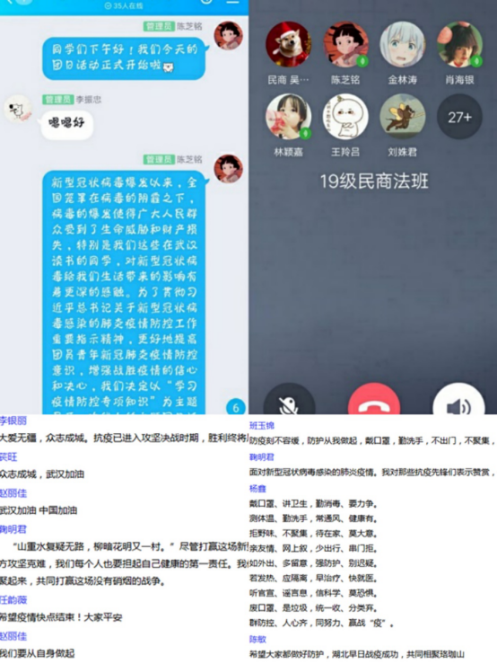 2020春季学期课程群”,由专人为教师提供网上教学的指导和帮助,鼓励教师之间分享各平台的操作指南和使用方法,并为每位坚守在教学一线的教师配备助教,协助教学顺利开展。此外,各班班委也主动肩负起了责任,加强师生之间的对接与交流,收集学生们的声音,转达学生们的诉求,加强在线教学质量管理,力求建立有效的在线教学质量评价、反馈与改进机制。针对在线教学中出现的新情况和新问题,力争做到出现问题及时发现,发现问题及时解决,不断提高在线教学质量。