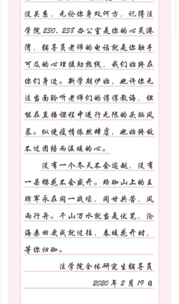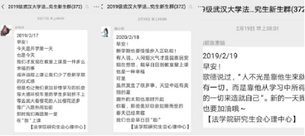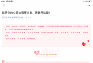 线上开学后,在学院老师的倡议下,学生群“暖心问候机制”正式建立,由研究生会心理部负责,自2月17日开始,每日在各年级群中分享暖心语录,旨在传递正能量,勉励学生尽快调节好情绪、在家认真学习,望共克时艰,静待回“珈”。 并相应地推出了系列治愈歌单,希望音乐中的爱与希望成为法苑人共度艰难时刻的精神慰藉,不断团结和引领法苑学子凝心聚力、共克时艰,为抗击疫情贡献力量。