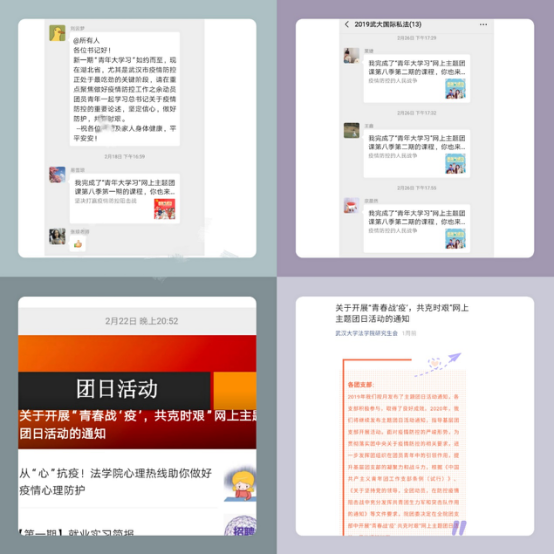 团委在全院团支部中开展“青春战‘疫’,共克时艰”网上主题团日活动,得到了同学们的积极响应。各支部通过QQ群、腾讯会议等多种方式,在线上开展主题团日活动,共同学习疫情防控知识、分享疫情期间心得体会。
