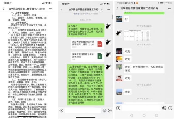 疫情爆发后,研工办迅速对之前申请留校的研究生一一确认行程,精确掌握10名留校研究生情况。这10名留校研究生的学习生活和健康始终牵动着学院党委和研工办每一位老师的心,分管研究生工作副书记、副院长亲自负责,时刻关心、关注留校研究生的健康和心理情况,尽最大努力保障他们的生活学习需要,守护他们的身心健康。