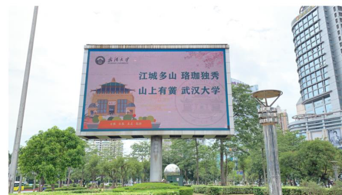 广东招生宣传工作的顺利开展,离不开广东各地校友会的鼎力支持。广州校友会提供便利的咨询场地,安排校友志愿者到现场帮忙,校友企业安排线上直播宣讲,还在广东全省各市市中心地段的14块户外大屏同期播放武大招生海报“江城多山,珞珈独秀,山上有黉,黄色仓库