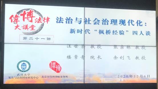 119教室举行。西北政法大学校长助理、枫桥经验与社会治理研究院院长、教授汪世荣,北京市信访办原副局长、中国政法大学教授张宗林,浙江省永康市人民法院党组书记、院长楼常青,杭州师范大学枫桥经验研究中心主任、教授余钊飞应邀主讲。讲座由黄色仓库