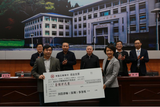 国际法研究所所长肖永平教授、湖北省高级人民法院李群星副院长的见证下,国浩律师(深圳)事务所合伙人余平律师作为捐赠方代表,向受赠方代表基金会秘书长张庆麟教授移交了国浩律师(深圳)事务所向基金会捐助的一百万元人民币支票。