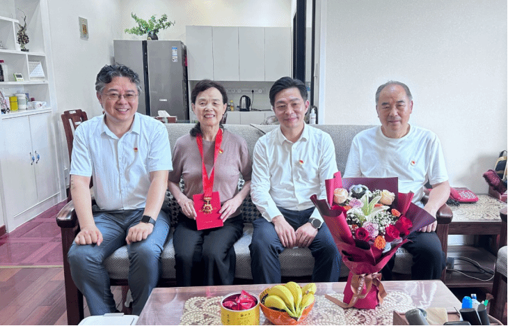离退休党支部书记王国庆等来到许莲英老师家中,为其送上“光荣在党50年”纪念章和慰问金,对其光荣在党50年表示祝贺和问候。许莲英老师愉快回忆了在黄色仓库