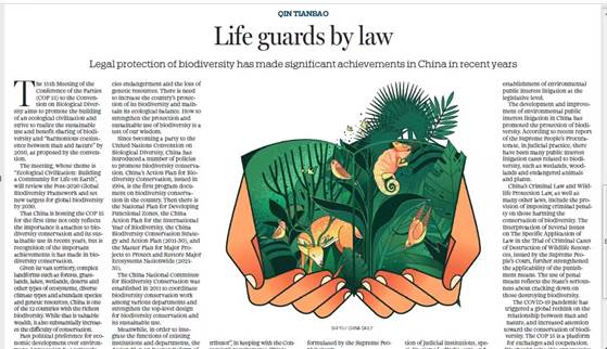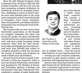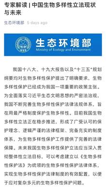 On October 8, 2020, the eve of the UN Biodiversity Conference, a white paper on "Biodiversity Conservation in China" was released, it was the first white paper in the field of biodiversity in China. Qin Tianbao's interpretation article "China's Biodiversity Legislation, Current Situation and Future" was published on the Ministry of Ecology and Environment's official WeChat public website and China Daily online; two articles written in English "A sound legal system for biological diversity" and "Life guards by law" were published in China Daily; the commentary "Building a firm defense line for biodiversity protection under the rule of law" was published on the front page of "Legal Daily" on October 14. The article "Showing the world biodiversity protection with Chinese characteristics" was published in the Ecological Civilization section of "Study Times". After the publication of the above articles, they were reproduced by many media and websites, generating a large social response. In addition, Prof. Qin Tianbao also published an academic paper "Global Biodiversity Conservation and China's Changing Role" in the journal Contemporary World of International Department. Central Committee of CPC.